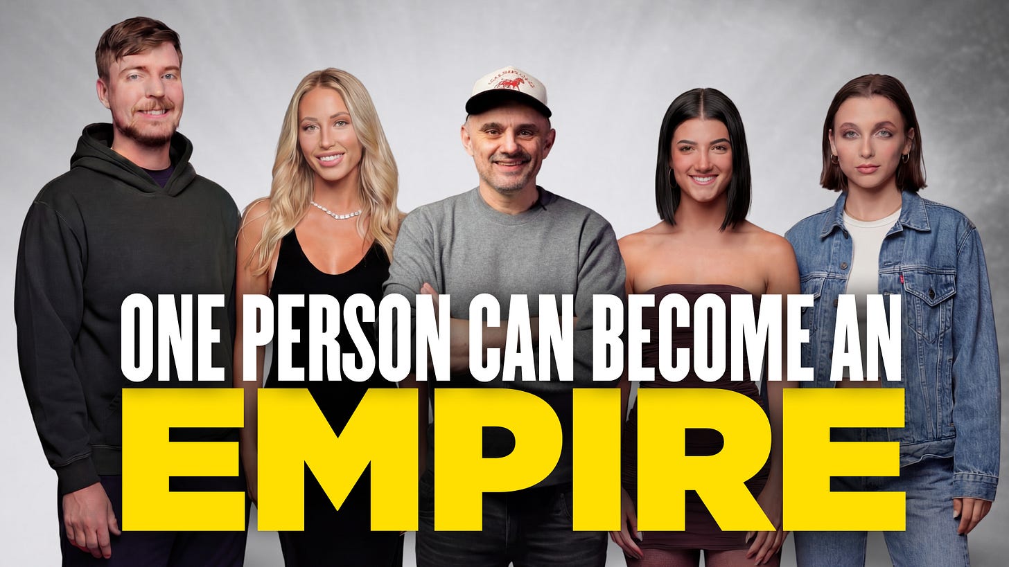 My book Crush It said that you can be an influencer in 2009, and that you can have a life making content on the internet. Now I’m telling you: Beast is the preview that you can build an empire on the back of a human.